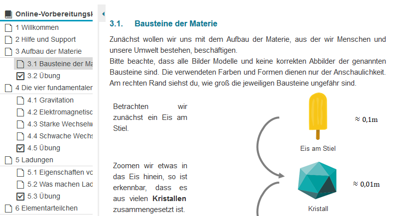 Der Vorbereitungskurs ist über die Online-Lernplattform OPAL zugänglich. Er gliedert sich in mehrere Abschnitte, die den Schülerinnen und Schülern schrittweise Einblicke in teilchenphysikalische Grundlagen vermitteln. Der erste Abschnitt beschäftigt sich mit dem Aufbau der Materie. Indem in ein Eis am Stiel hineingezoomt wird, können die Schüler/innen schrittweise Unterstrukturen erkennen. Als kleinste Materiebausteine ergeben sich die Elementarteilchen Up-Quark, Down-Quark und Elektron.