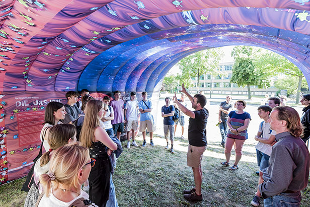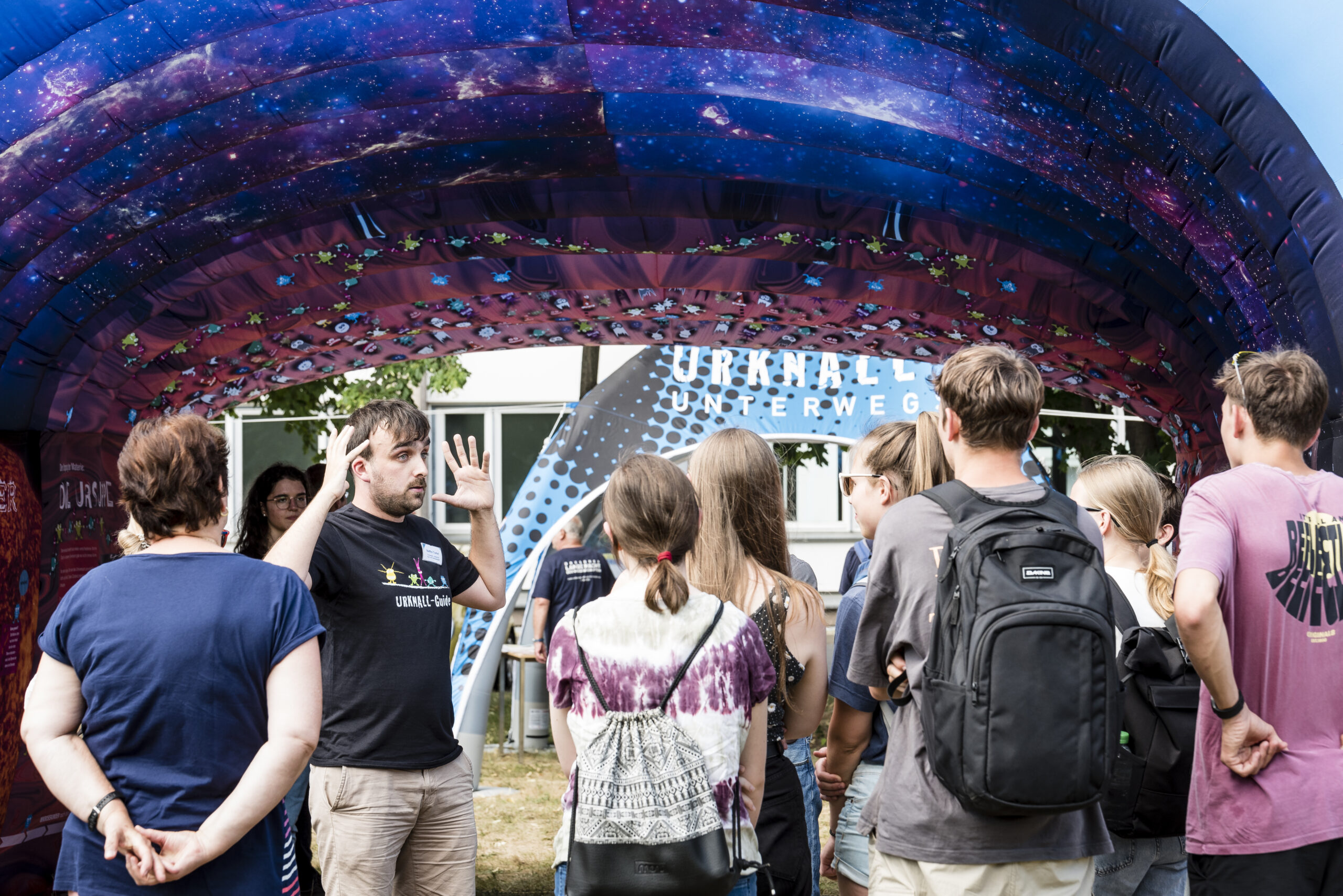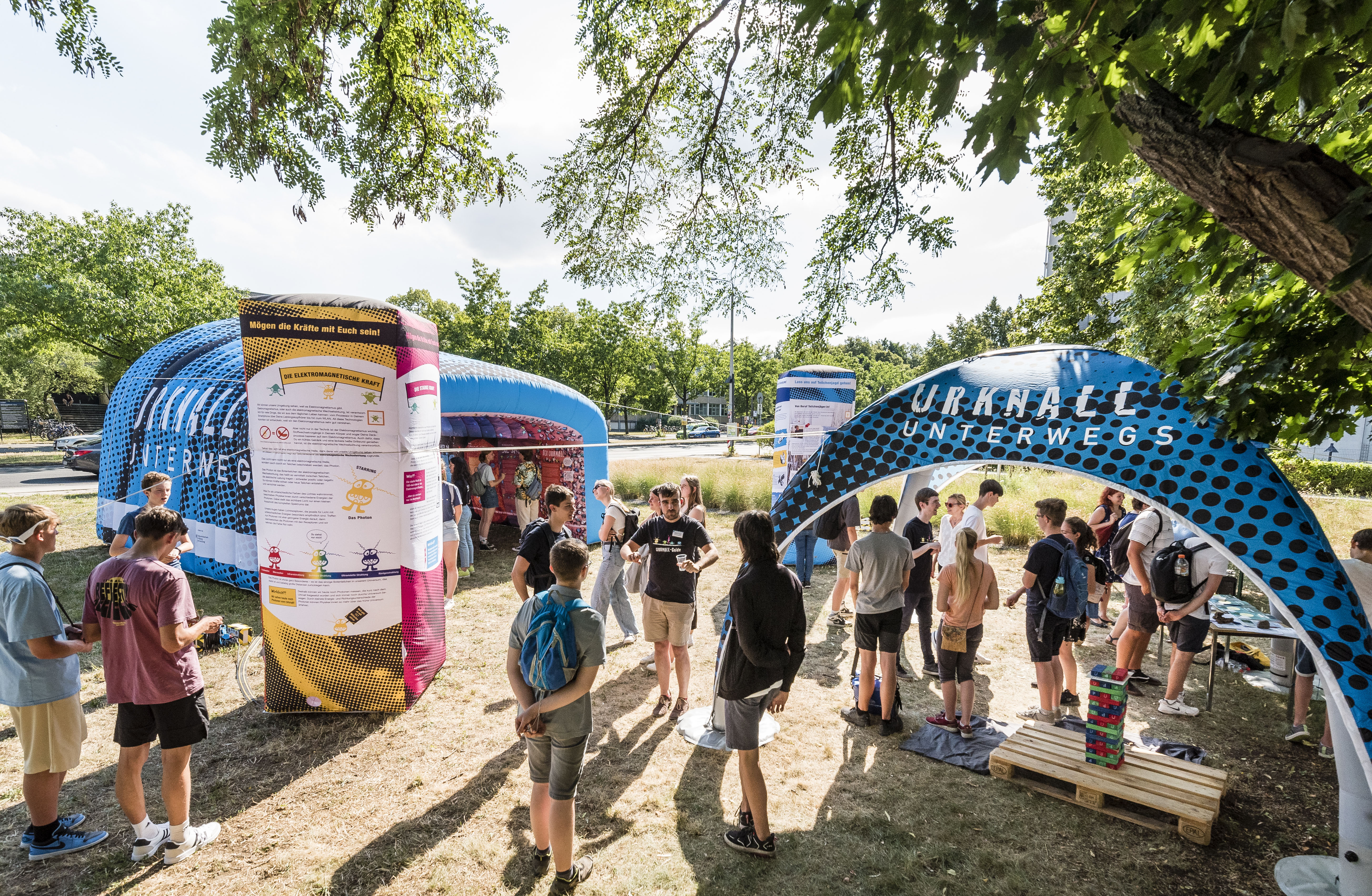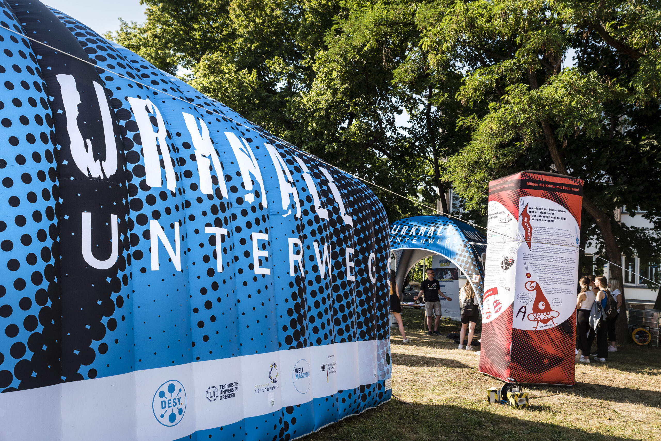 Hier ein Einblick in die Dresdner Veranstaltungen mit der mobilen Ausstellung „Urknall unterwegs“, die dazu einlädt, die Entstehung des Universums zu erkunden und Vorträgen am Abend vor interessiertem Publikum.